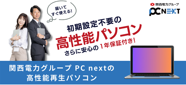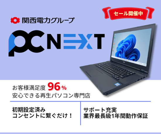 PC next(ピーシーネクスト)は、関西電力グループの100%子会社が運営する、中古・再生パソコン専門のオンラインショップです。