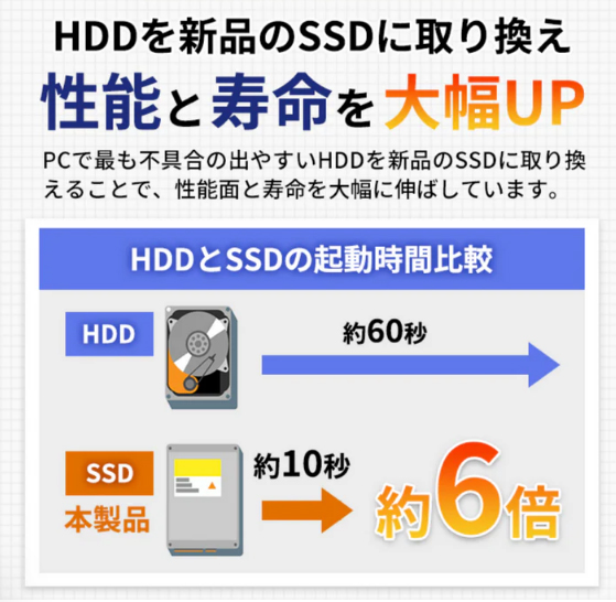 中古PCにありがちな、動作が重い、起動に時間がかかるといったストレスを排除し、サクサクと快適な操作感を実現しています。