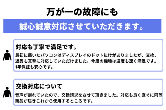 万が一の不具合にも対応してもらえるため、新品を買うときと同じような安心感を得られます。